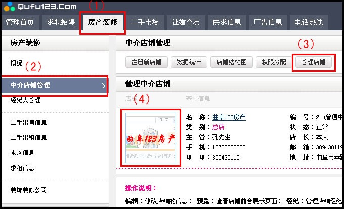 1、進(jìn)入用戶中心,點(diǎn)擊房產(chǎn)裝修->中介店鋪管理->管理店鋪,然后點(diǎn)擊需要修改的店鋪的店標(biāo),如下圖所示: