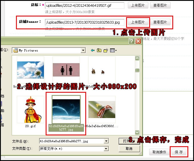 2、進(jìn)入店鋪編輯界面,點(diǎn)擊店鋪Banner后面的上傳圖片,選擇設(shè)計(jì)好的圖片文件上傳,最后點(diǎn)擊保存,完成了!~~預(yù)覽下,看看效果吧!